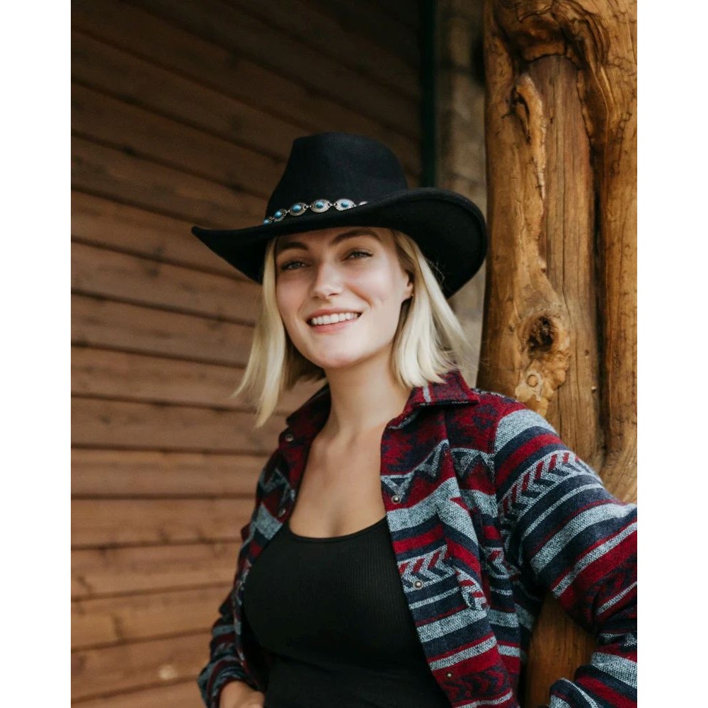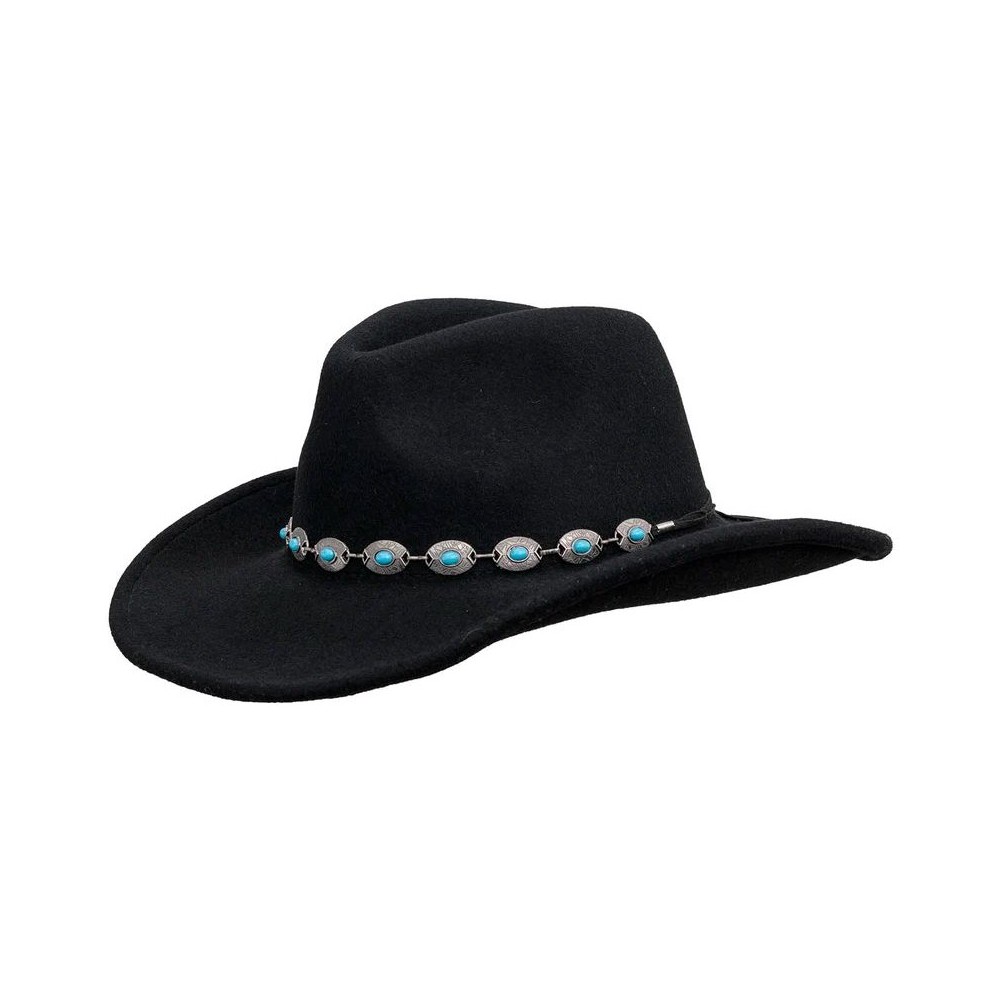 The Silverton is one elegant hat! Made from 100% Australian Wool and black paired with a stunning silver and turquoise hatband, complete with tassels.