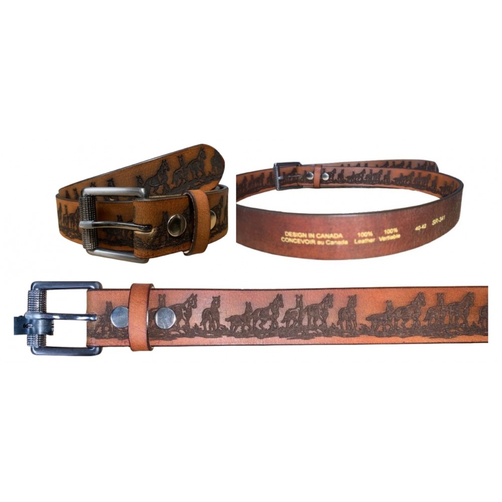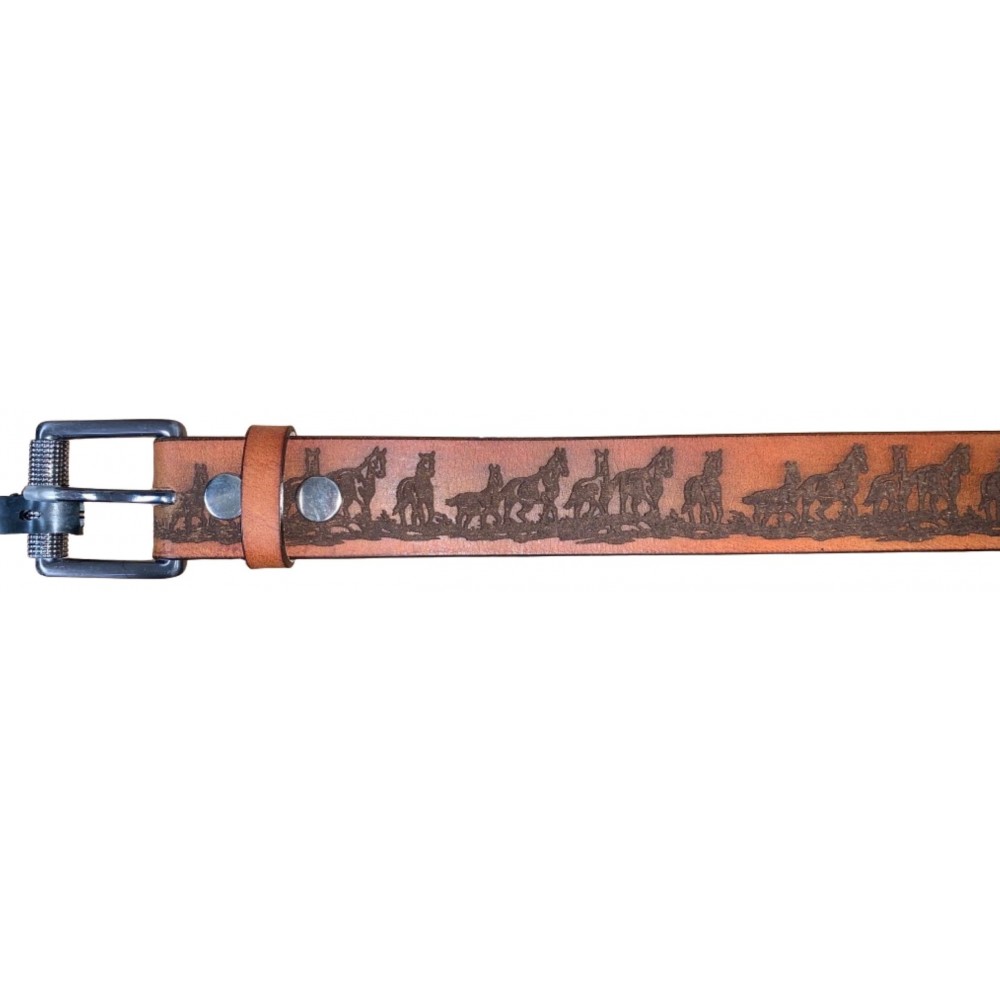100% Leather Brown Belt with Embossed Horses and Interchangeable Buckle