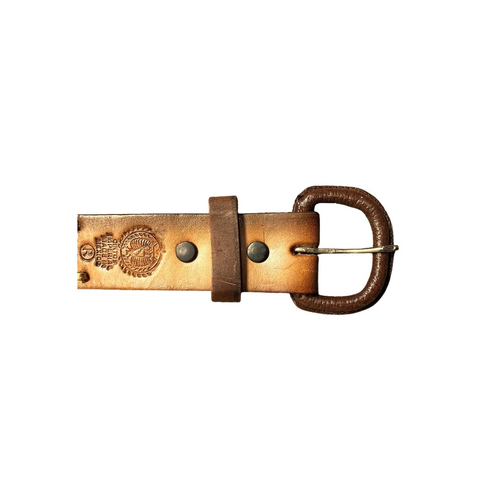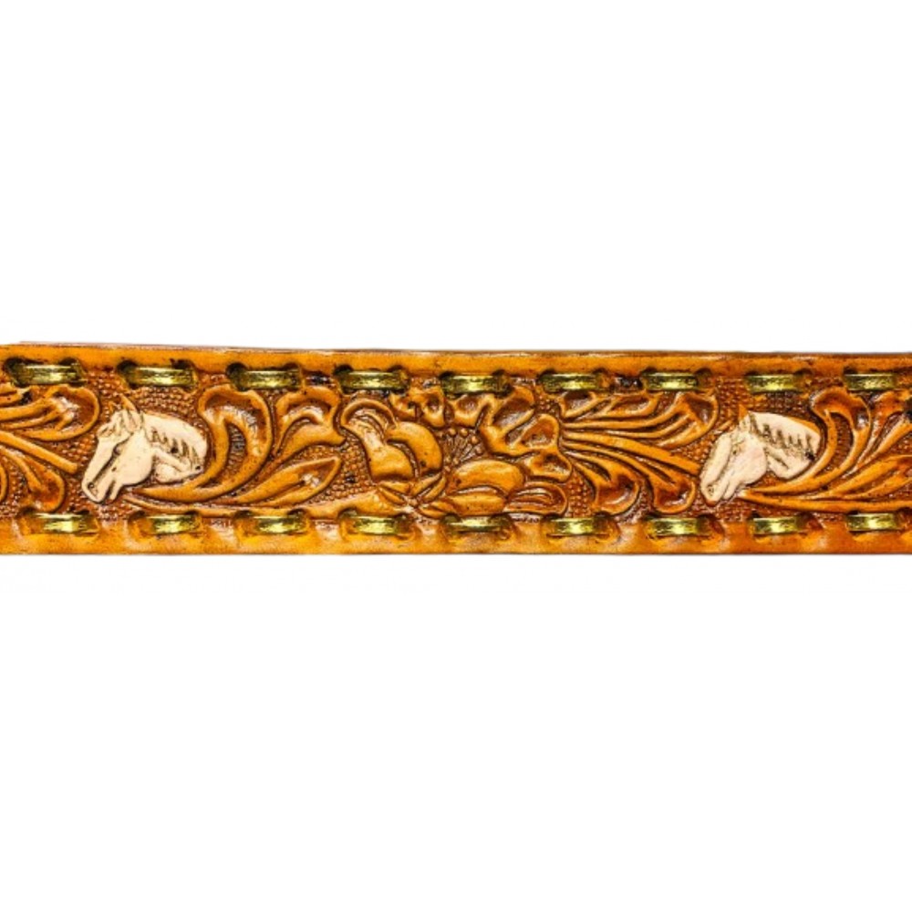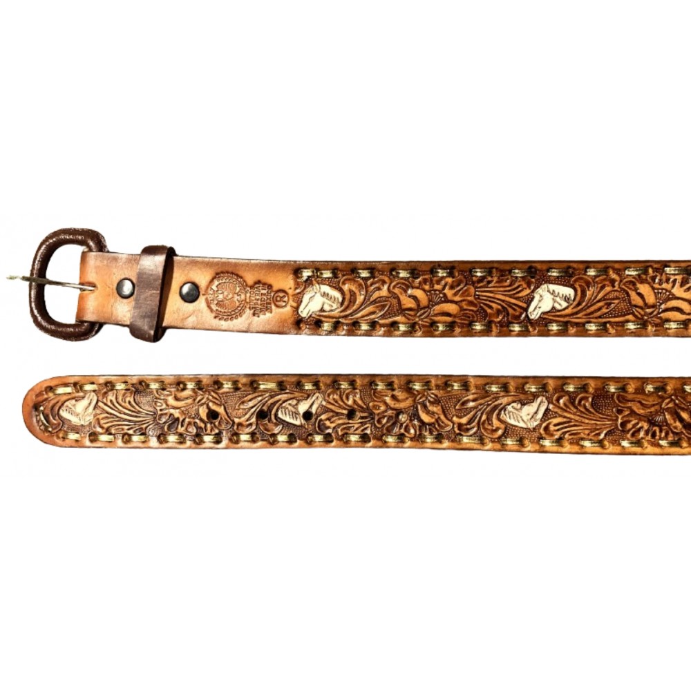 100% Leather Brown Belt, Embossed Design and Horse Heads, Removable Buckle
