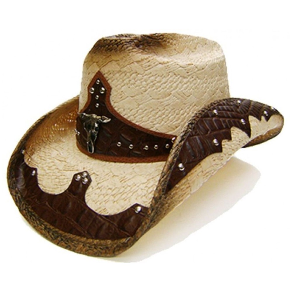 • 8483 2 tone brown & beige straw cowboy hat with antiqued metal bull head center piece, metal studded faux leather hatband & appliques